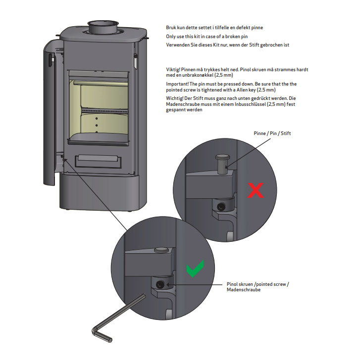 Esto puede provocar que la bisagra se suelte de la cámara de combustión y se salga de su correcta posición, lo que puede provocar lesiones. Si este tornillo está suelto en su estufa, apriételo con una llave Allen hexagonal hasta que Jøtul AS le entregue un nuevo tornillo correcto.